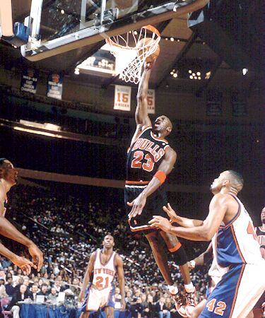 Michael Jordan wearing a pair of original red/white/black Air Jordan I's in his last game at Madison Square Garden during the '97-'98 season