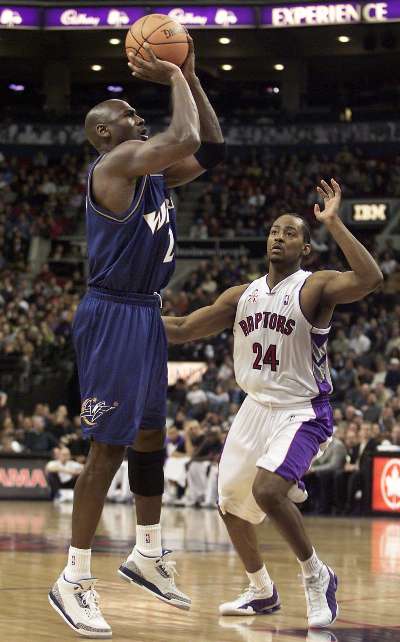 Michael Jordan wearing the white/true blue Air Jordan III Retro in a pre-season game against the Toronto Raptors in '01