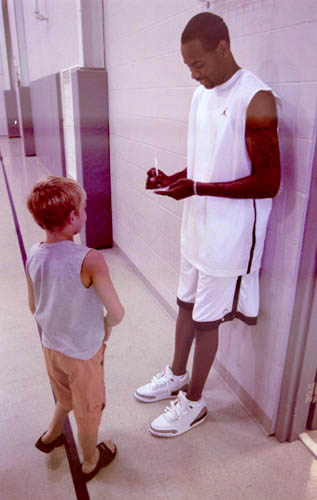 Derek Anderson wearing the white/grey Air Jordan III Retro while giving an autograph to a fan at a training facility