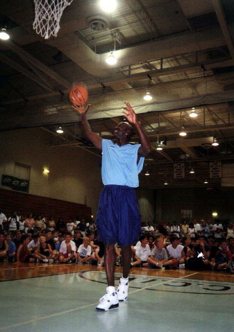 Michael Jordan wearing the white/navy Air Jordan IV Retro in one of his personal training camps for kids