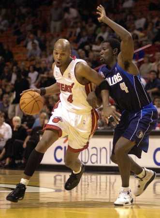 Michael Finley wearing the white/navy Air Jordan IV Retro in the '01-'02 season against the Miami Heat