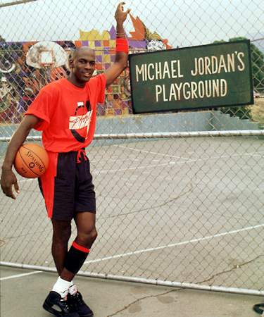 Michael Jordan wearing the black/silver Air Jordan V during the video-shoot for 'Michael Jordan's Playground'