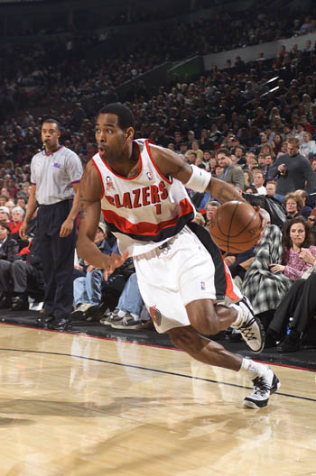 The Blazers' Derek Anderson wearing the player-exclusive white/black Air Jordan IX Retro low during the late '01-'02 season