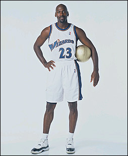 Michael Jordan wearing the white/black Air Jordan XI Retro in his first photo-shoot for the Washington Wizards