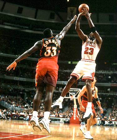 Michael Jordan wearing the white/black Air Jordan XII during the '96-'97 NBA season with the Chicago Bulls