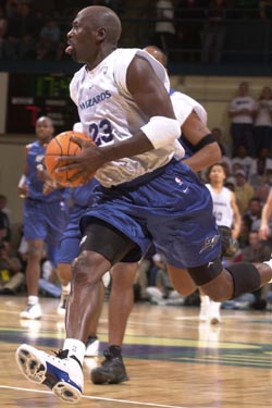 Michael Jordan wearing the white/blue Air Jordan XVII during the Wizards' training camp in '01